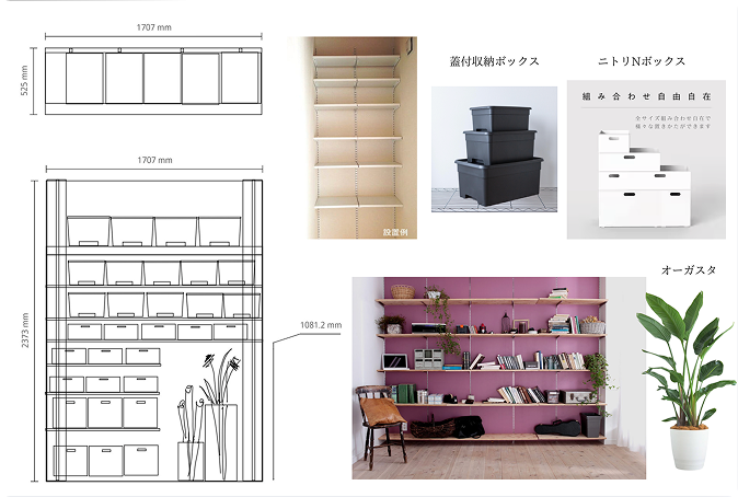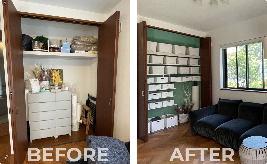 ドライフラワーやクラフト制作が趣味のお客様。多様な材料や道具の収納に悩まれていたため、収納計画から棚板設置までをサポートしました。