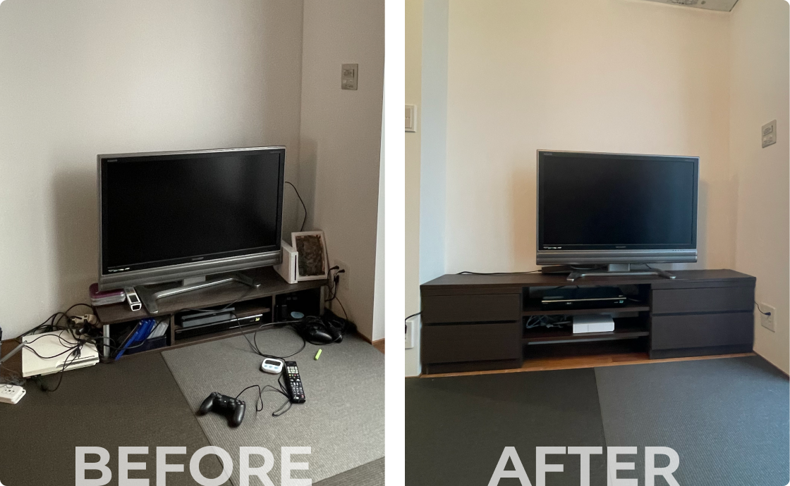和室の窪みには既製品を加工して造作風のTVボードを設置。コストを抑えながらも統一感ある仕上がりに喜んでいただけました。