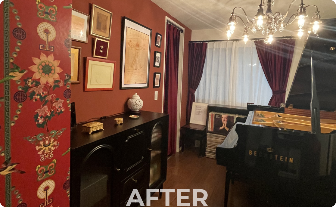 お好きなシノワズリ柄の個性的な輸入壁紙を主役に、空間全体をデザイン。オンラインでの講座や配信でも背景が美しく映え、唯一無二の存在感を放っています。教室としても、生徒さんの感性を刺激し、表現の幅を広げるようなインスピレーションに満ちた空間となりました。