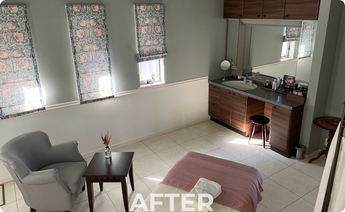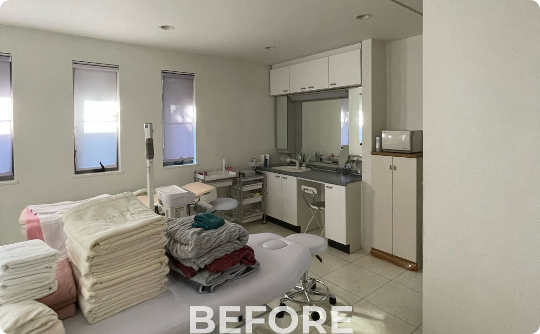 使い勝手・予算・デザインのバランスを取りながらDIYも交えてご提案し、カウンセリングルームやエステルームも“お客様”と“ご自身”の両者が心地よくいられる空間に再構築しました。